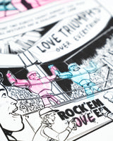 This exclusive, hand-crafted print bundle consists of two retouched prints, each featuring a unique comic-inspired interpretation of my sculpture, "Rock'Em, Love'Em Robots", created for Mattel creations. Only 20 sets are available, making this a truly tight and rare edition.